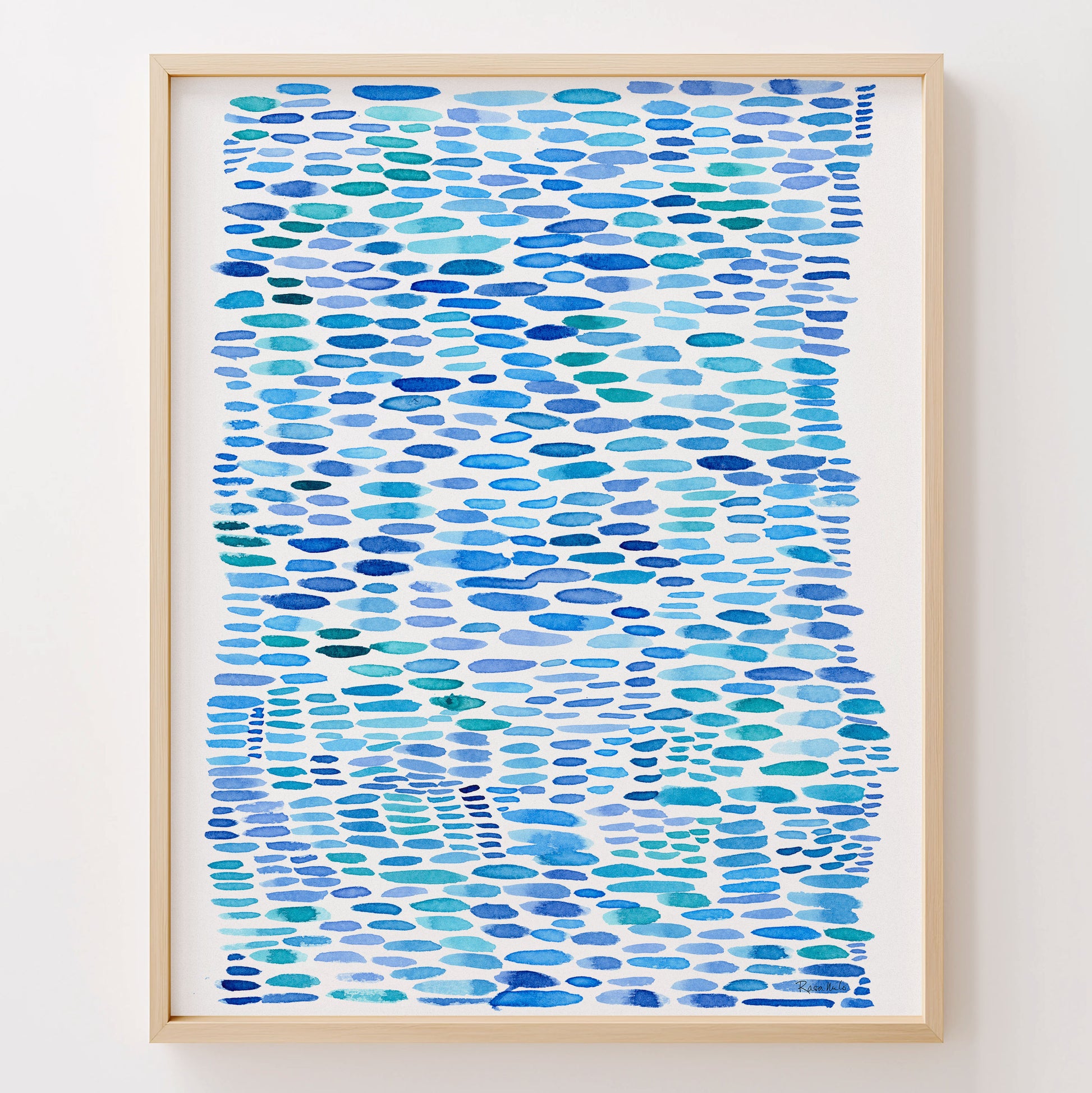 "Sea Glass Scatter" is an ocean-inspired abstract featuring soft, layered blues and organic shapes, reminiscent of sea glass scattered along the shoreline.